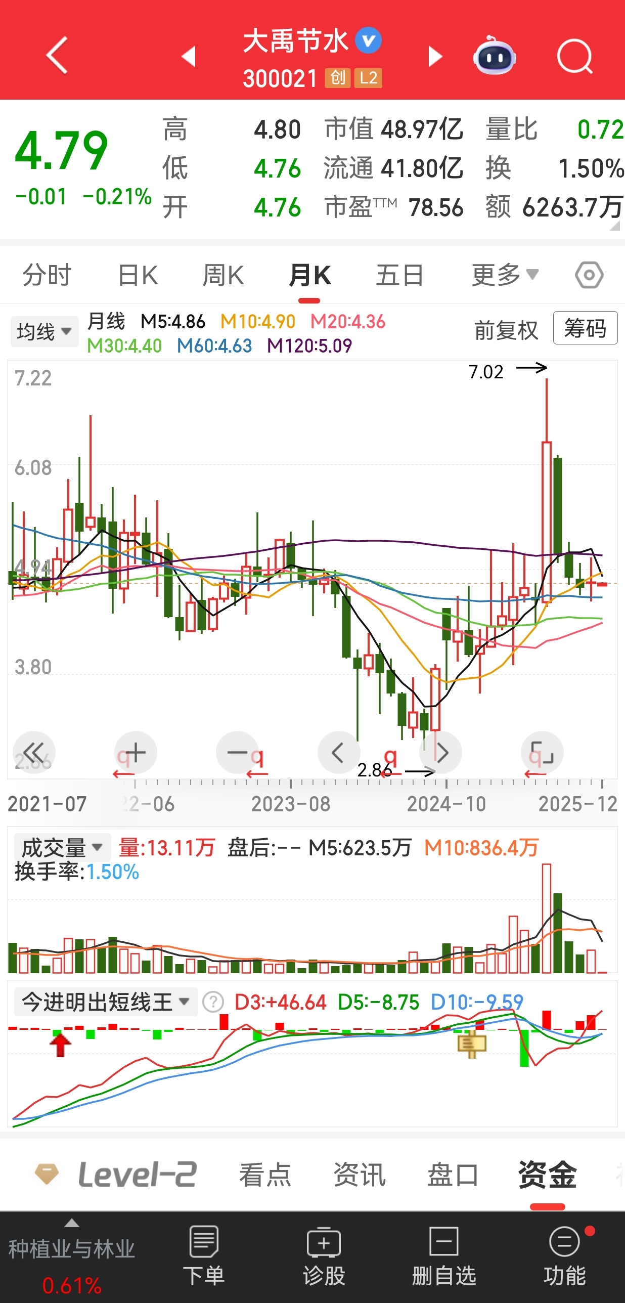 $大禹节水(SZ300021)$ 月线暂时看到4.4,季度极限看到3.78