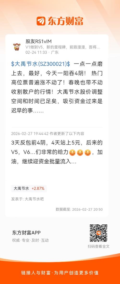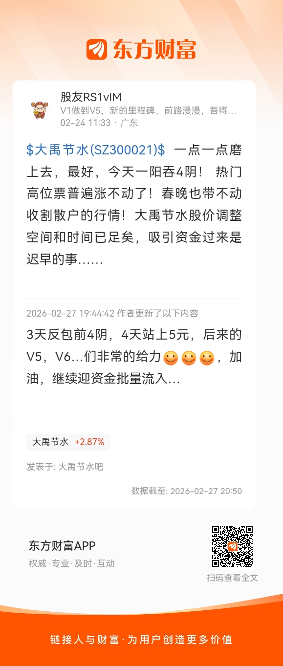 $大禹节水(SZ300021)$ 一点一点磨上去,最好,今天一阳吞4阴! 热门高位票普遍涨不动了!春晚也带不动收割散户的行情!大禹节水股价调整空间和时间已足矣,吸引资金过来是迟早的事……