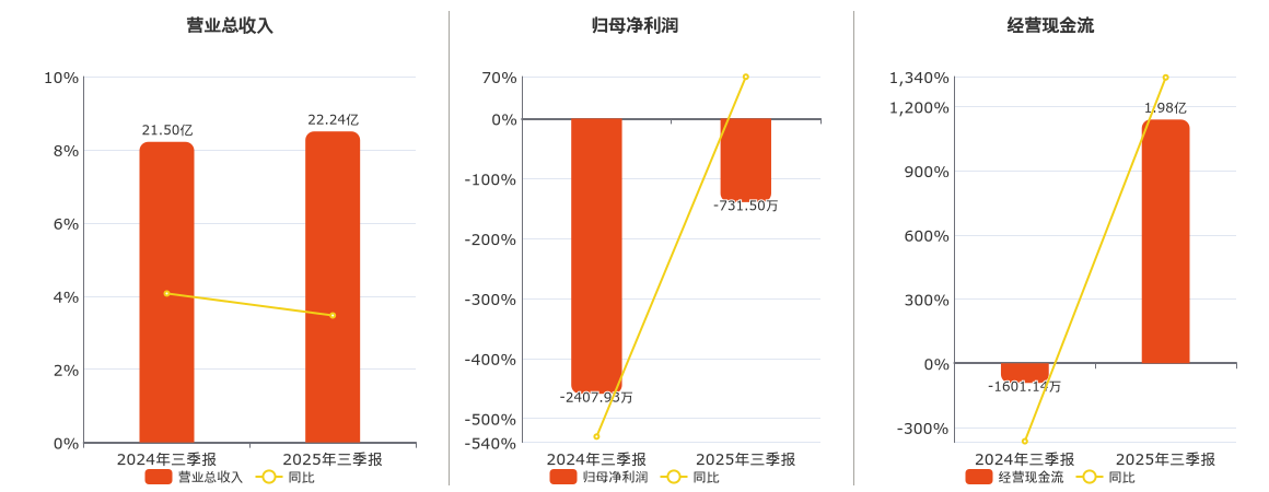 公司营业总收入为22.24亿元。归母净利润为-731.50万元。经营活动现金净流入为1.98亿元。