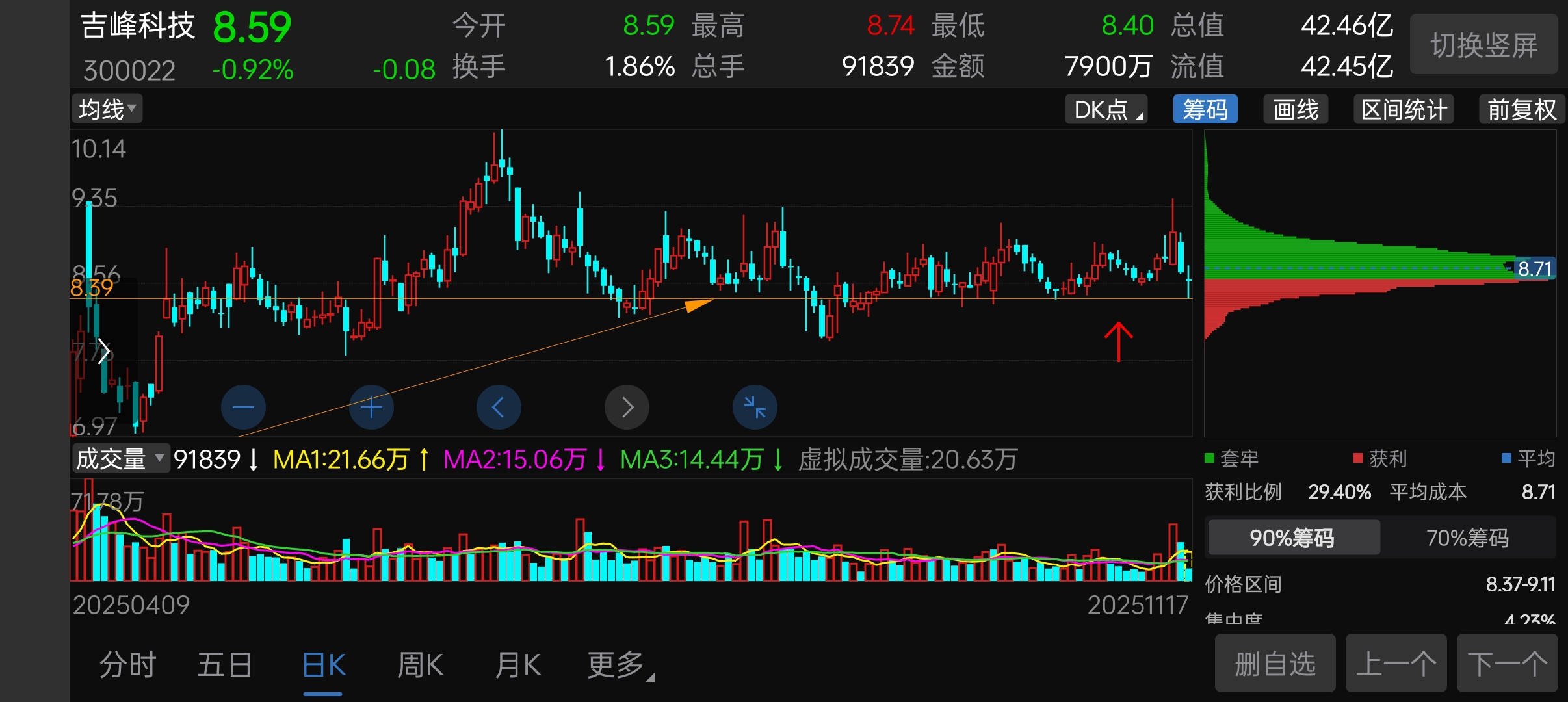 $吉峰科技(SZ300022)$ 刚好站在我上周画的线。嘿嘿。每个人方法不一样。有得赚就行