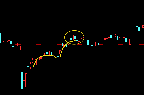 都是“圆弧形”的结构,这种经典结构是盘整性质,并非主升。考虑到已经7连阳,随时会达到圆弧顶部,然后进入右侧回落部分。目前就相当于5月份图中的圆圈标识处,调整即将来临了。
