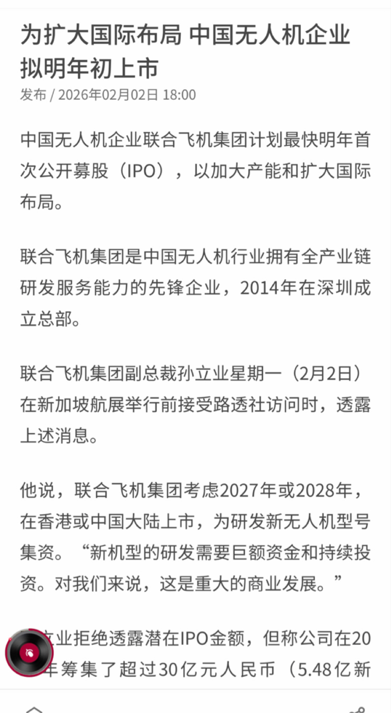 中国无人机企业联合飞机集团计划最快明年首次公开募股(IPO),以加大产能和扩大国际布局。吉峰科技起飞