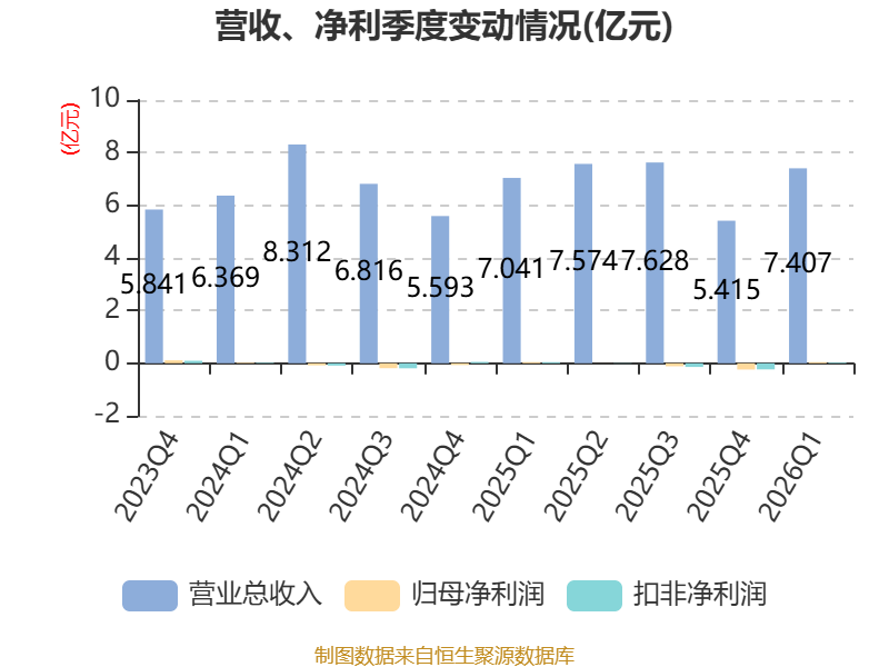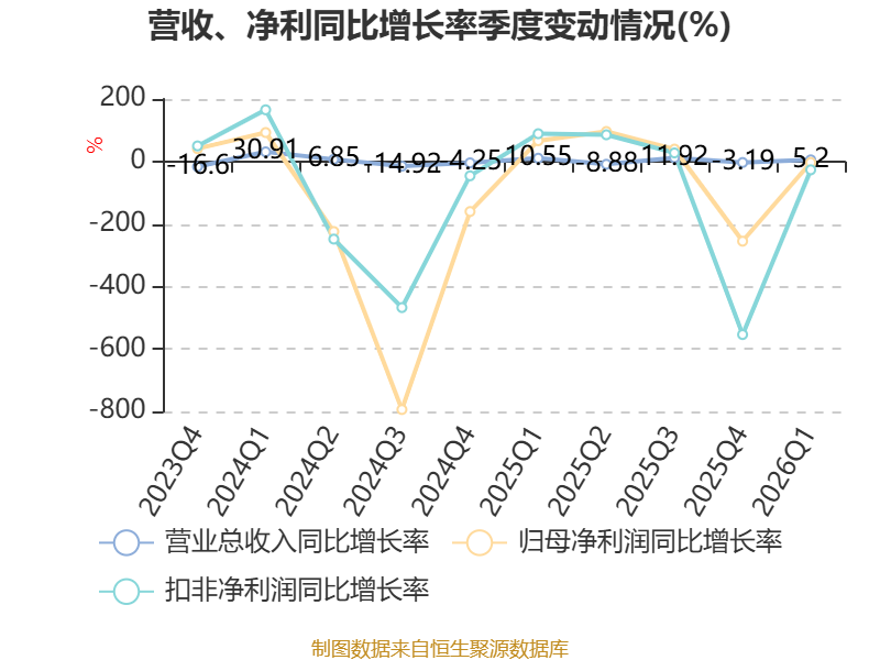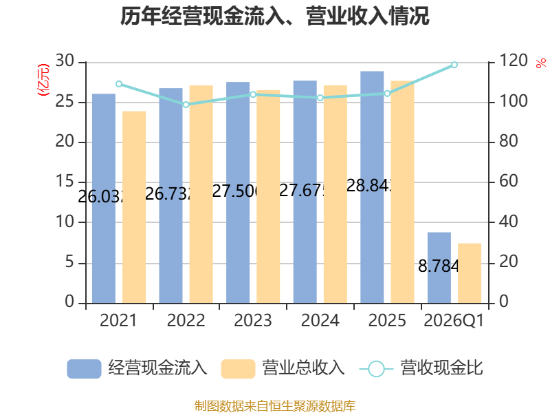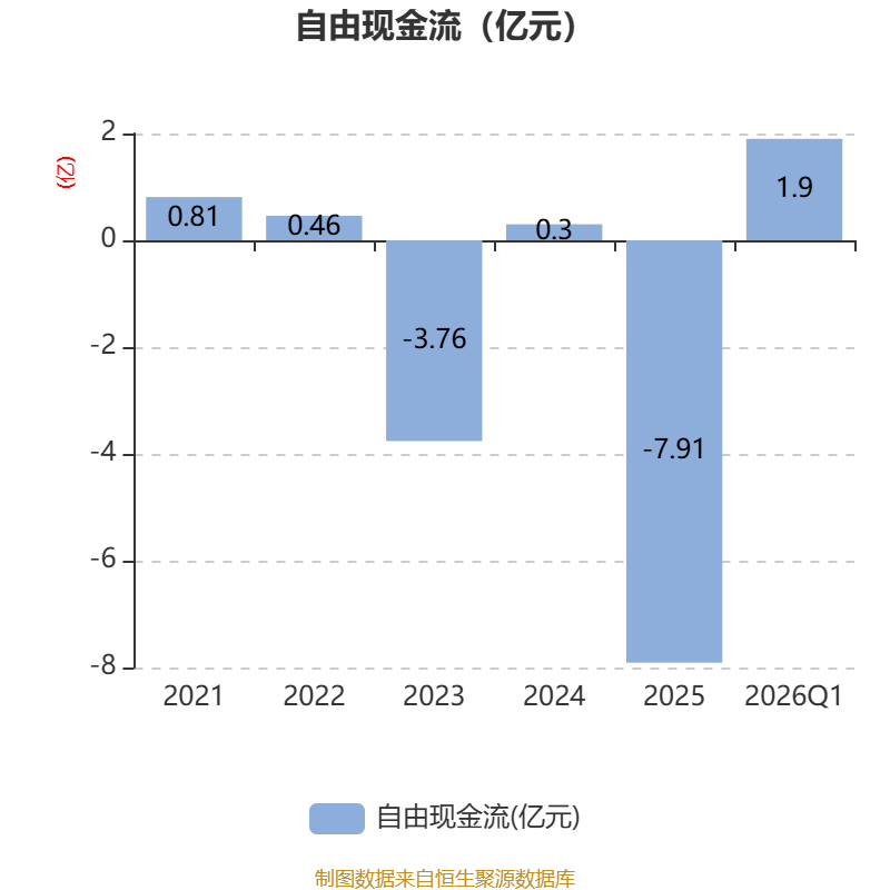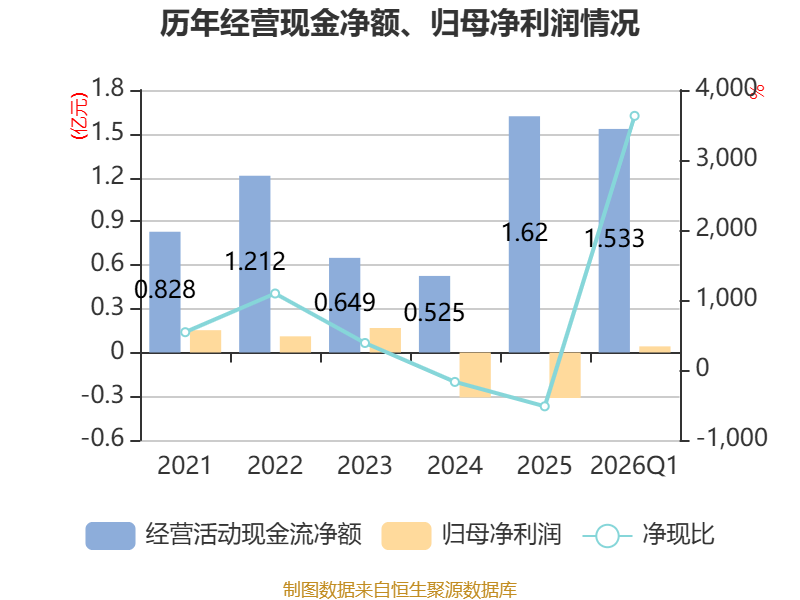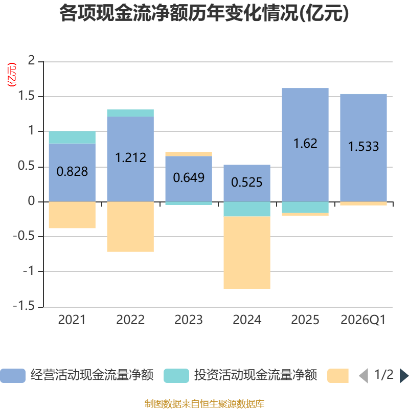 截至2026年一季度末,公司经营活动现金流净额为1.53亿元,同比增长124.14%;筹资活动现金流净额-546.35万元,同比减少1.07亿元;投资活动现金流净额11.89万元,上年同期为-31.84万元。