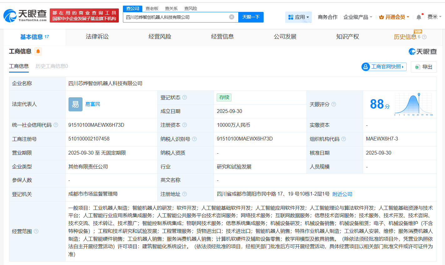 南方财经10月9日电,天眼查App显示,近日,四川芯烨智创机器人科技有限公司成立,法定代表人为易富民,注册资本1亿人民币,经营范围包括工业机器人制造、智能机器人的研发、人工智能基础软件开发等,由中国五冶集团有限公司、机器人(300024)、四川简州空港产融投资发展集团有限公司共同持股。