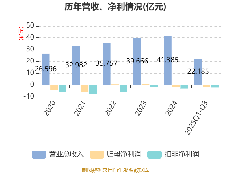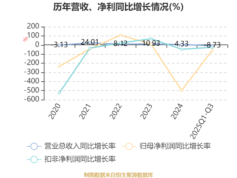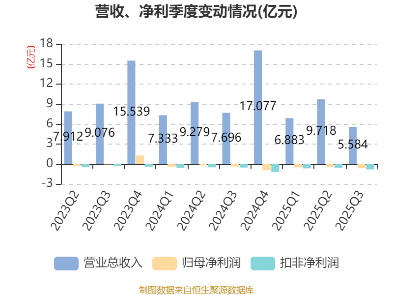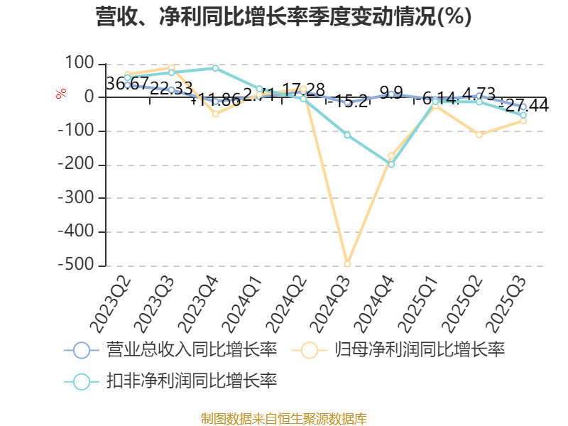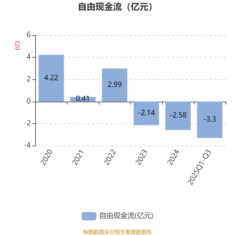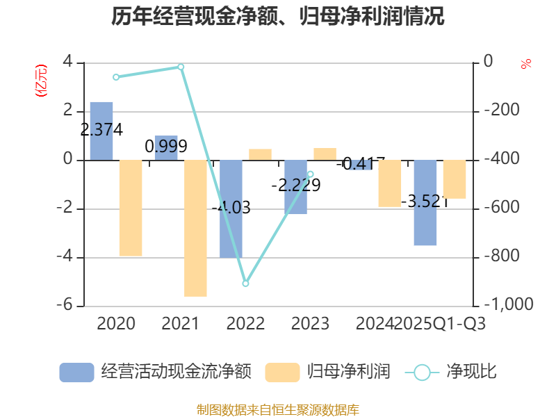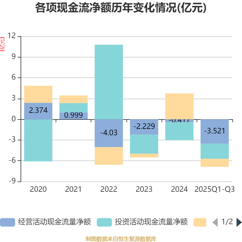 2025年前三季度,公司经营活动现金流净额为-3.52亿元,同比减少1.33亿元;筹资活动现金流净额-1.16亿元,同比减少5.36亿元;投资活动现金流净额-2.19亿元,上年同期为-2.4亿元。