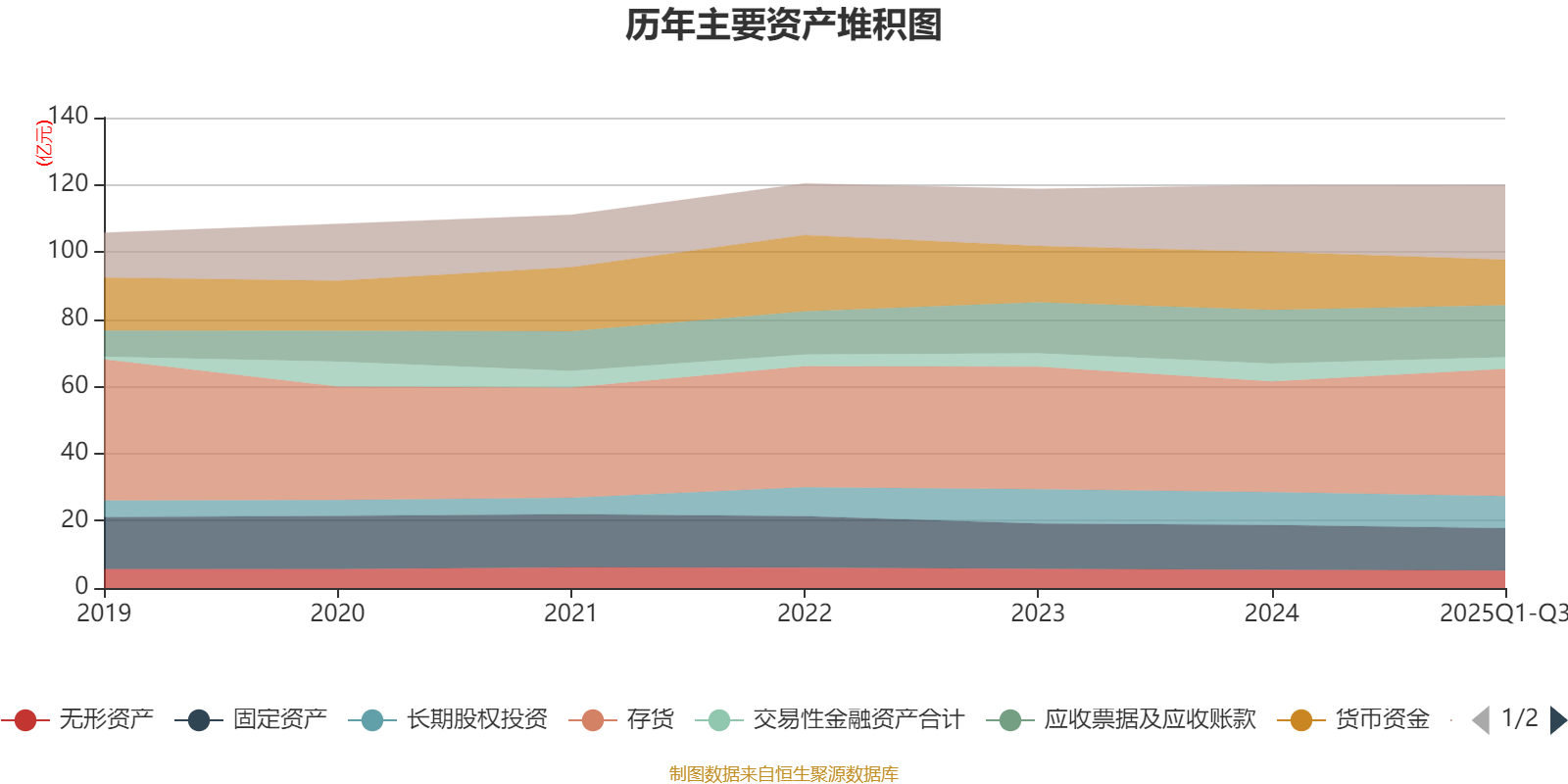 资产重大变化方面,截至2025年三季度末,公司存货较上年末增加14.89%,占公司总资产比重上升4.08个百分点;货币资金较上年末减少22.08%,占公司总资产比重下降3.2个百分点;交易性金融资产合计较上年末减少34.18%,占公司总资产比重下降1.53个百分点;预付款项较上年末增加112.26%,占公司总资产比重上升1.52个百分点。
