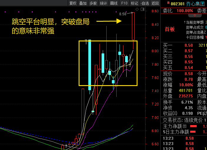 早盘做这票,有两种考量:1.大科技昨天主打CPO,今天可能轮动到前期的AI应用,早评文章也提到了这个方向。而齐心是正宗的AI大模型+文化IP概念,也有盘前利好的大消费概念。2. 技术面看,它跳空高开明显,下面是个盘整平台,强势突破平台的意图非常明显。