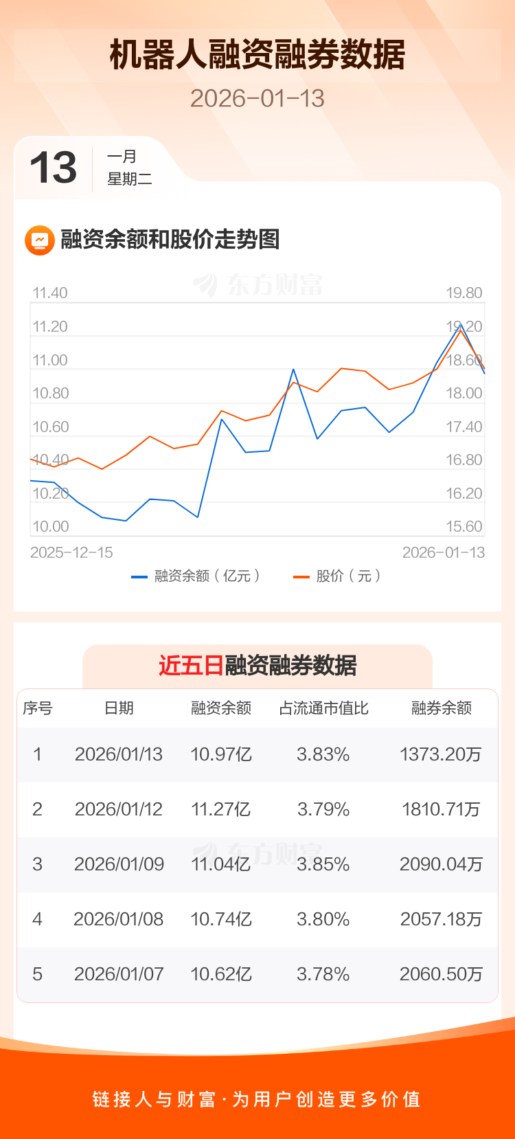 交易所最新数据显示,机器人于2026年1月13日获融资买入8895.76万元,融资偿还1.18亿元,当日融资净偿还2922.54万元。目前,该股融资余额10.97亿,占流通市值比例为3.83%。