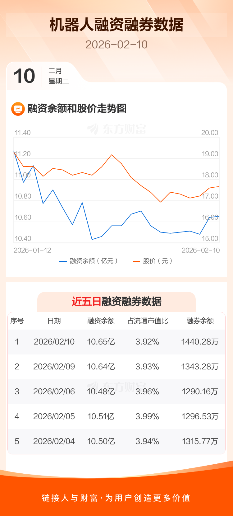 交易所最新数据显示,机器人于2026年2月10日获融资买入4311.53万元,融资偿还4224.18万元,当日融资净买入87.35万元。目前,该股融资余额10.65亿,占流通市值比例为3.92%。