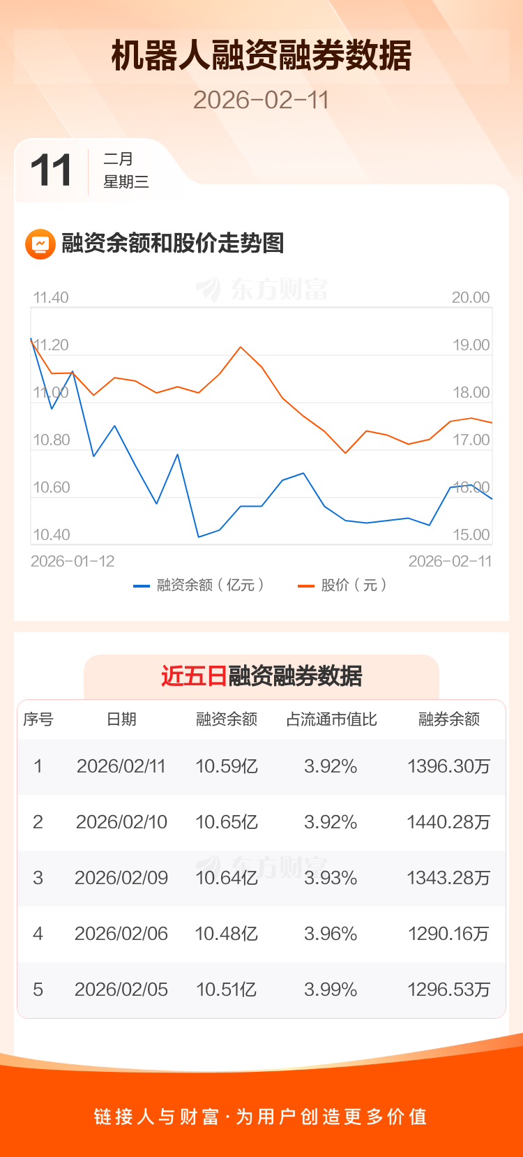交易所最新数据显示,机器人于2026年2月11日获融资买入2434.28万元,融资偿还3039.12万元,当日融资净偿还604.85万元。目前,该股融资余额10.59亿,占流通市值比例为3.92%。