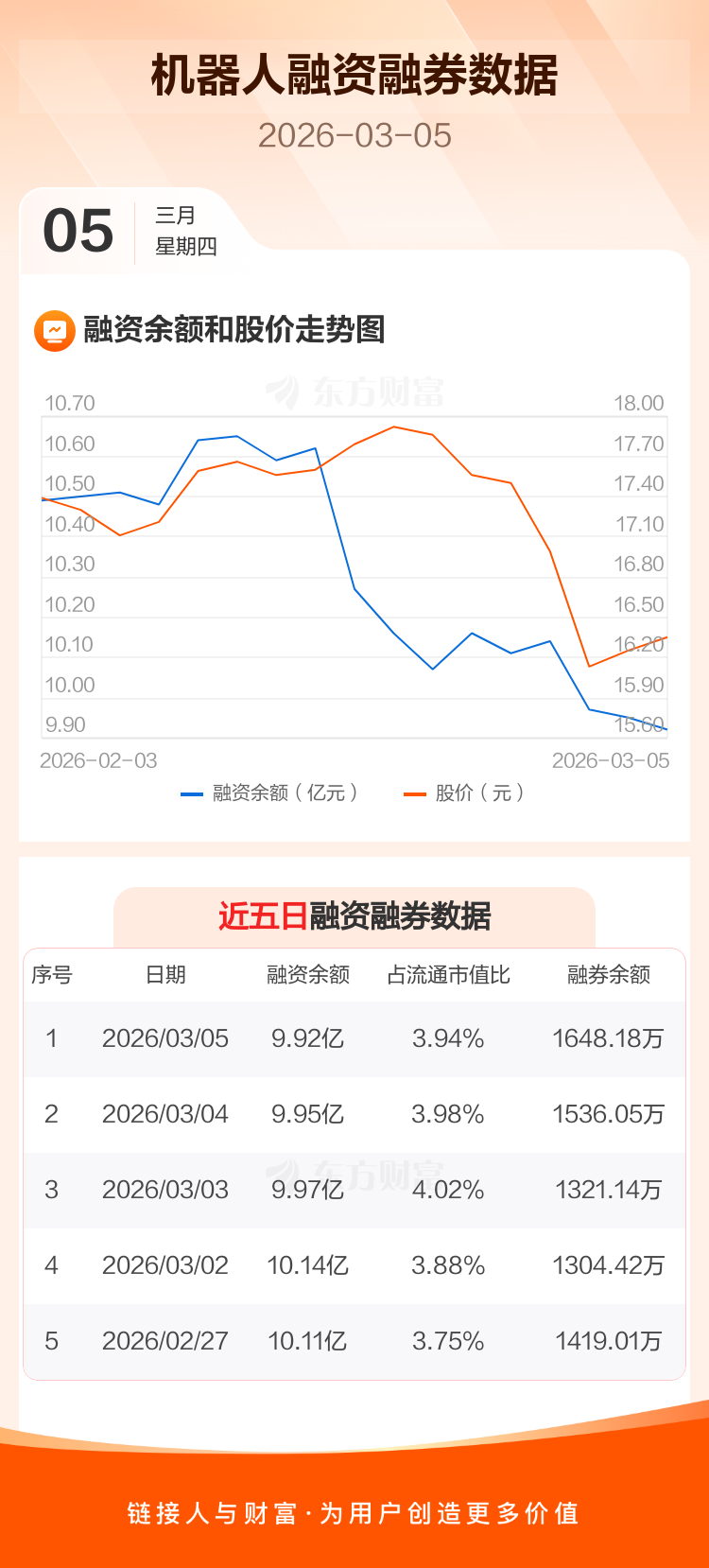 交易所最新数据显示,机器人于2026年3月5日获融资买入1642.38万元,融资偿还1991.29万元,当日融资净偿还348.91万元。目前,该股融资余额9.92亿,占流通市值比例为3.94%。