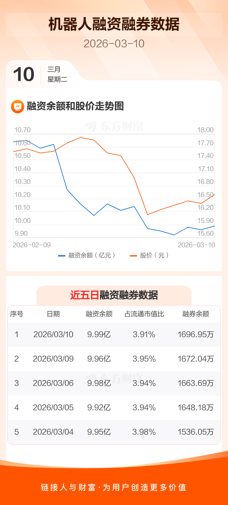 交易所最新数据显示,机器人于2026年3月10日获融资买入2466.55万元,融资偿还2199.85万元,当日融资净买入266.7万元。目前,该股融资余额9.99亿,占流通市值比例为3.91%。
