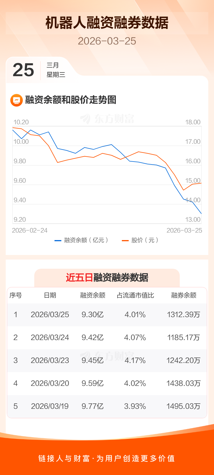 交易所最新数据显示,机器人于2026年3月25日获融资买入1215.96万元,融资偿还2401.38万元,当日融资净偿还1185.42万元。目前,该股融资余额9.30亿,占流通市值比例为4.01%。