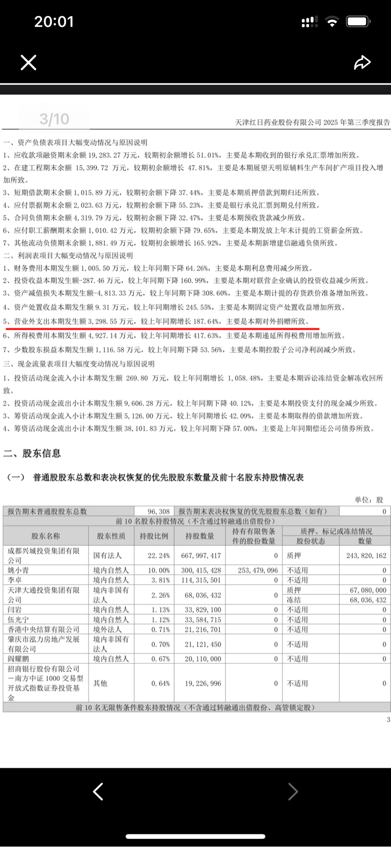 $红日药业(SZ300026)$ 2025年3季报显示营业外支出近3300万为对外捐款!为何金额巨大没有单独公告捐款给谁?为何捐款?