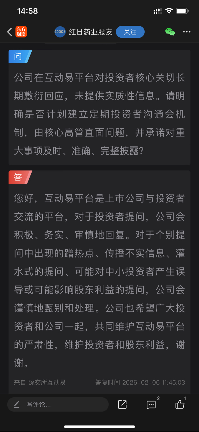 $红日药业(SZ300026)$ 董秘就近期回复谁看懂了?投资者却被扣帽子蹭热度、灌水式…