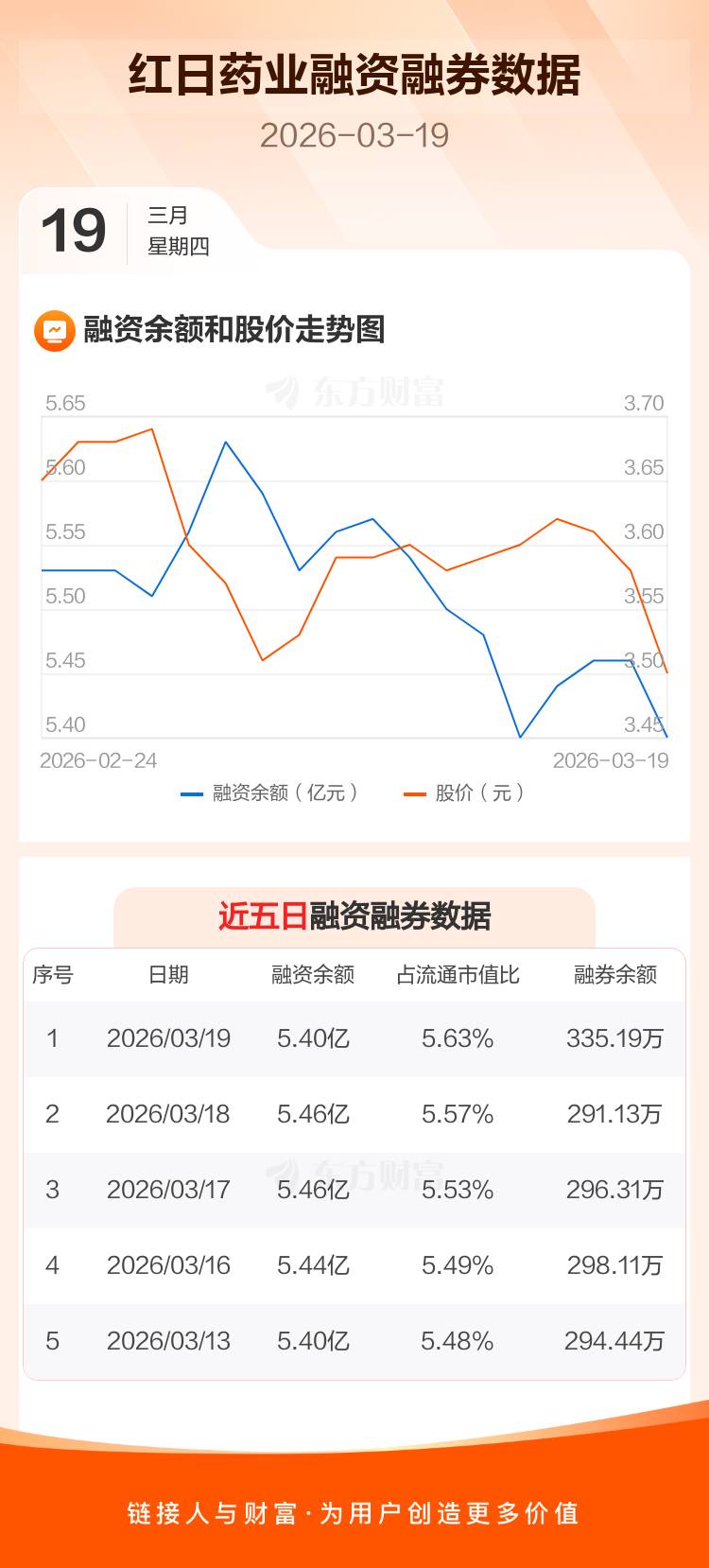 交易所最新数据显示,红日药业于2026年3月19日获融资买入499.20万元,融资偿还1091.16万元,当日融资净偿还591.96万元。目前,该股融资余额5.40亿,占流通市值比例为5.63%。