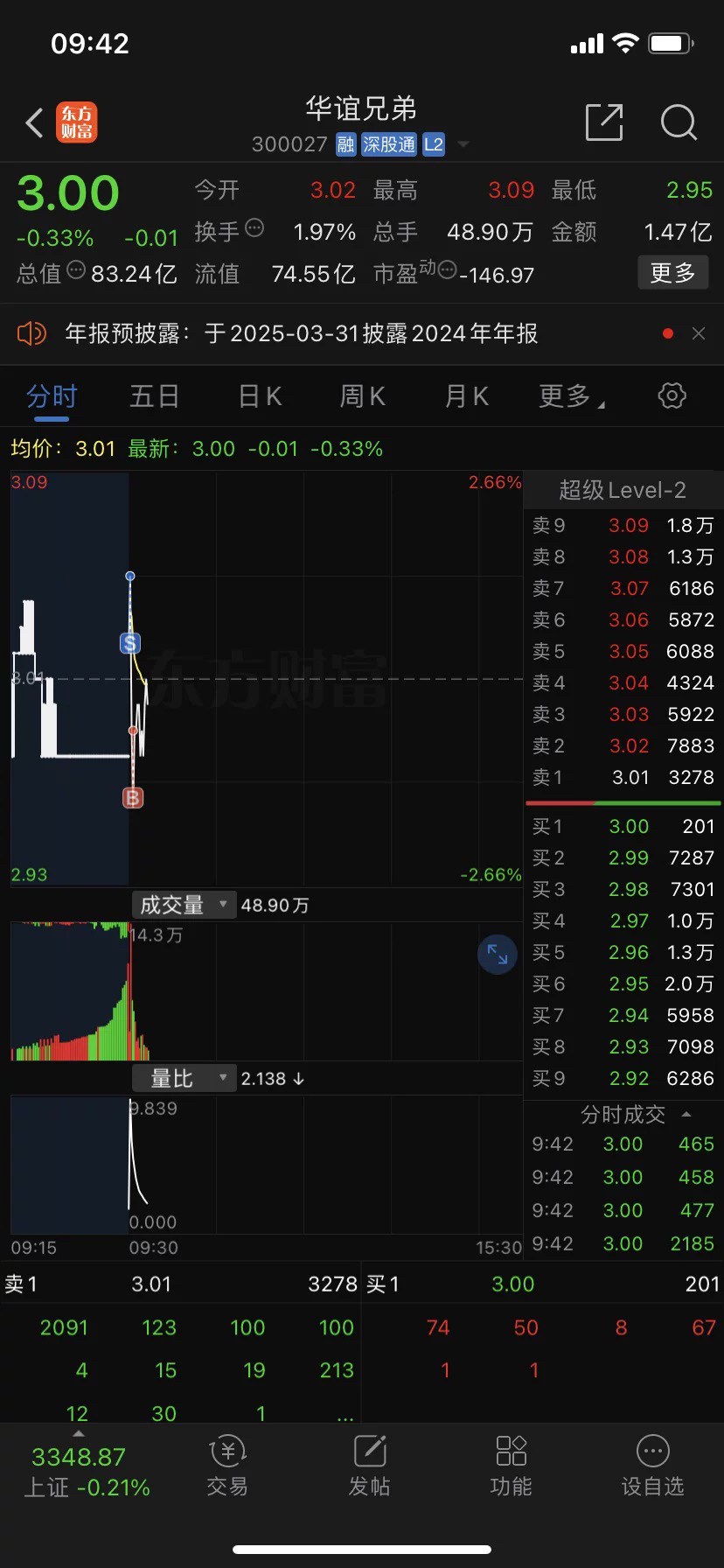 华谊兄弟2.91元赚钱卖出[赚大了][财神][财力]