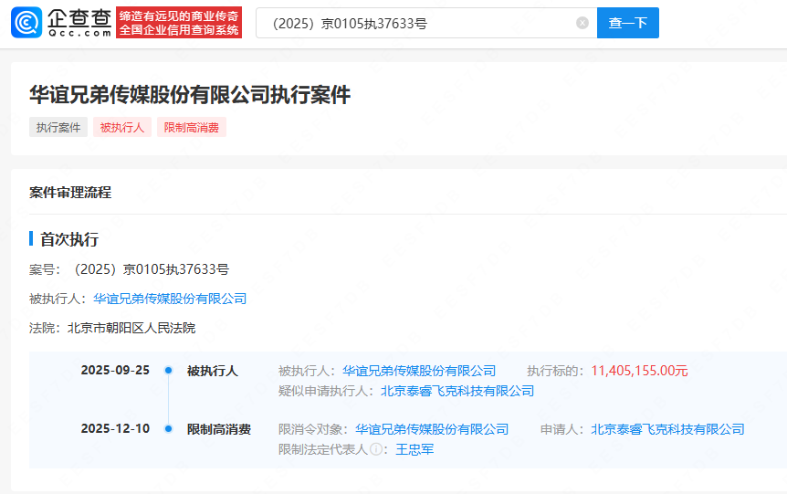 12月12日,21财经·南财快讯记者注意到,企查查APP显示,近日,华谊兄弟(300027.SZ)及其法定代表人王忠军因广告合同纠纷一案被限制高消费,申请人为北京泰睿飞克科技有限公司。此前,该公司因此案已被执行1140余万。