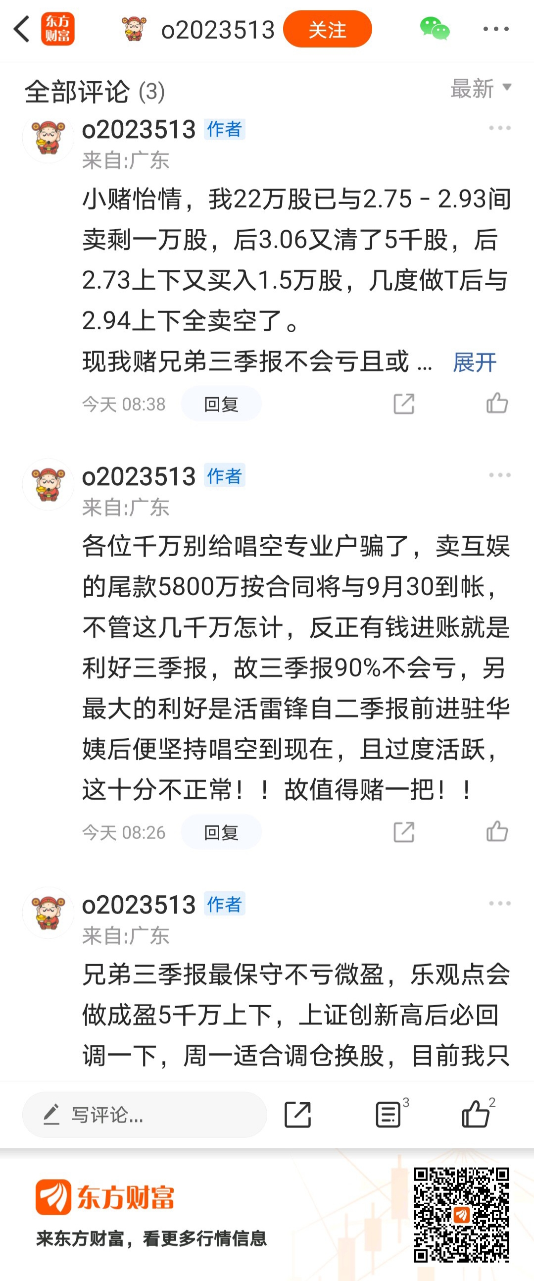 还有这苟东西,这是接上一个发的,这个苟东西二三季报都说会盈利,结果一次一次,打这苟东西脸,这苟东西有特点,发帖和评论,用不了多长时间就赶紧删,这明显做贼心虚啊,还到处说别人是托,哦对了,这苟东西还有一个特点,就是变脸特别快,刚说完苟斗是托,转身就管苟斗叫哥,苟斗也算是碰上对手了