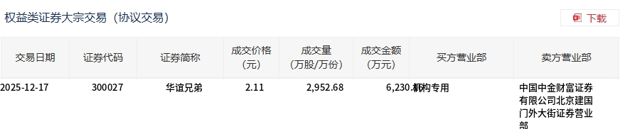 华谊兄弟今日大宗交易折价成交2952.68万股,成交额6230.16万元