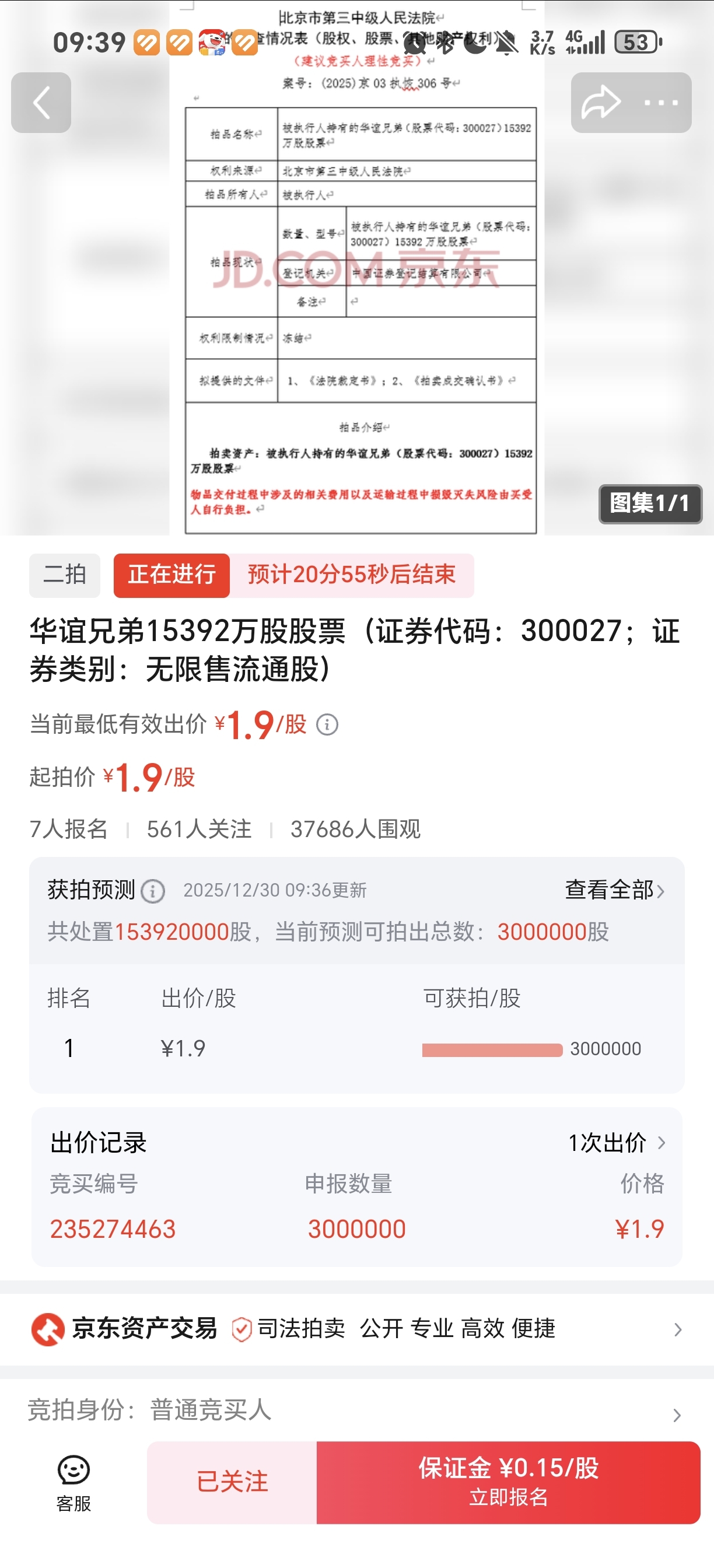 $华谊兄弟(SZ300027)$ 七人报名出价才一人,这能拍卖完吗,不会有拍卖不出去了吧