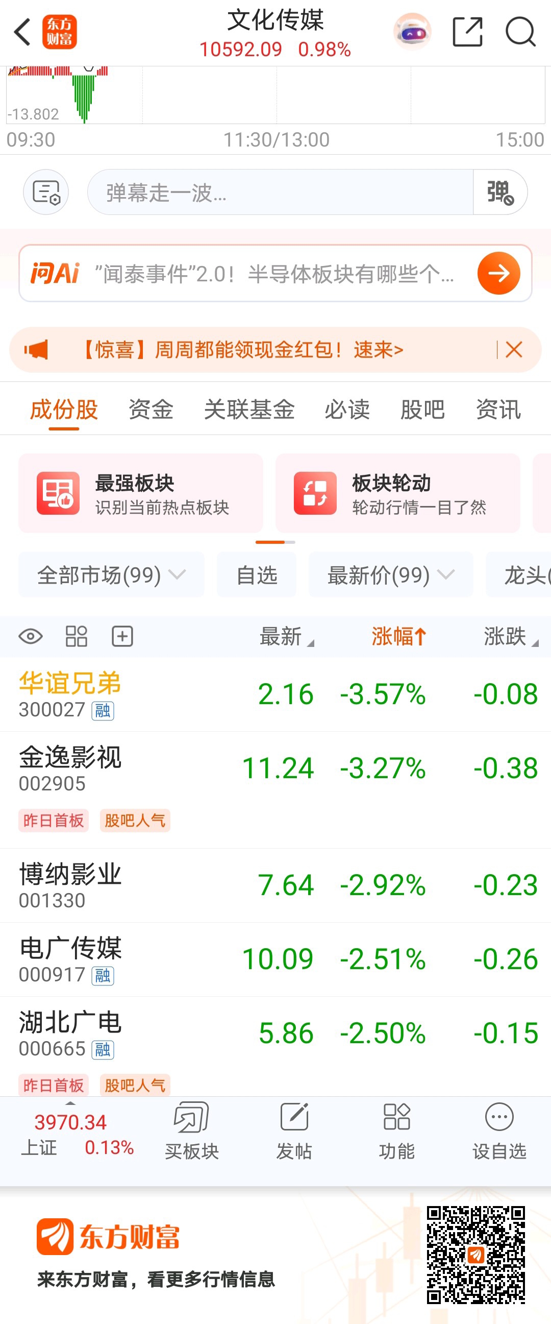 昨天告诉你们拉高出货,昨天跑步进场的,都懵逼了吧,文化传媒板块大涨没有,华谊跌幅