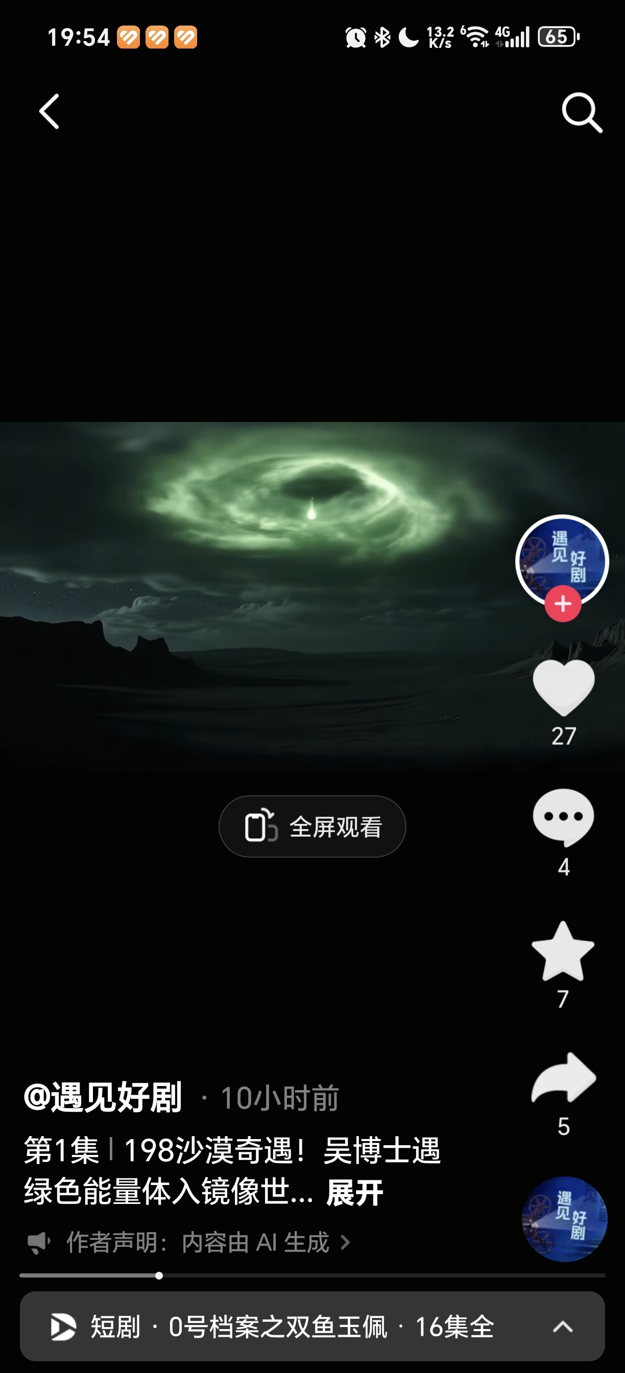 华谊兄弟制作的AI短剧《0号档案之双鱼玉佩》看了几集剧情和特效很不错,播放量才6