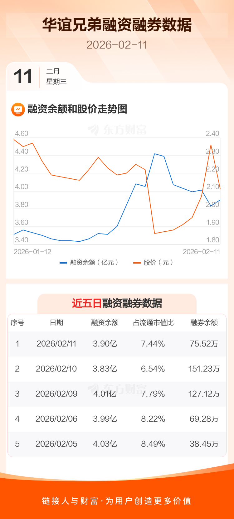 交易所最新数据显示,华谊兄弟于2026年2月11日获融资买入1666.40万元,融资偿还992.33万元,当日融资净买入674.07万元。目前,该股融资余额3.90亿,占流通市值比例为7.44%。