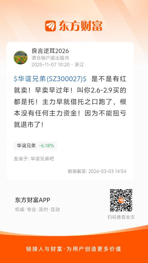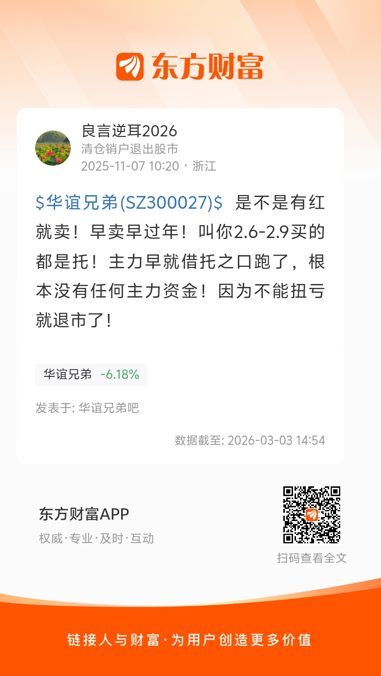 $华谊兄弟(SZ300027)$ 是不是有红就卖!早卖早过年!叫你2.6-2.9买的都是托!主力早就借托之口跑了,根本没有任何主力资金!因为不能扭亏就退市了!