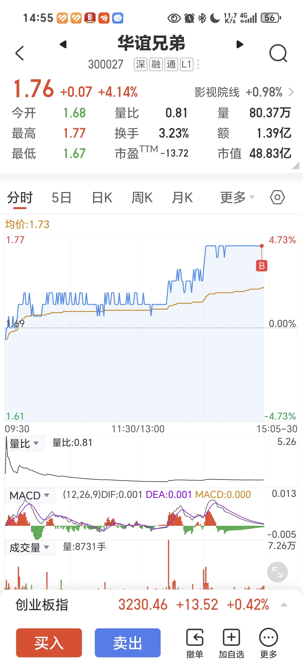 量能换手率增加尾盘直接1.76买入20万股,今晚热播网剧逐玉上线周末两天大火,下周华谊兄弟股票会有一波上涨行情,预测一下下周直接高开高走有可能拉涨停板
