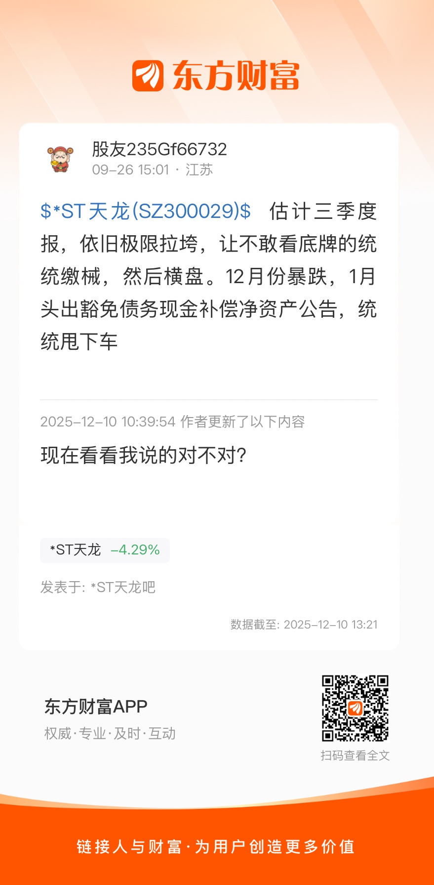 $*ST天龙(SZ300029)$ 估计三季度报,依旧极限拉垮,让不敢看底牌的统统缴械,然后横盘。12月份暴跌,1月头出豁免债务现金补偿净资产公告,统统甩下车