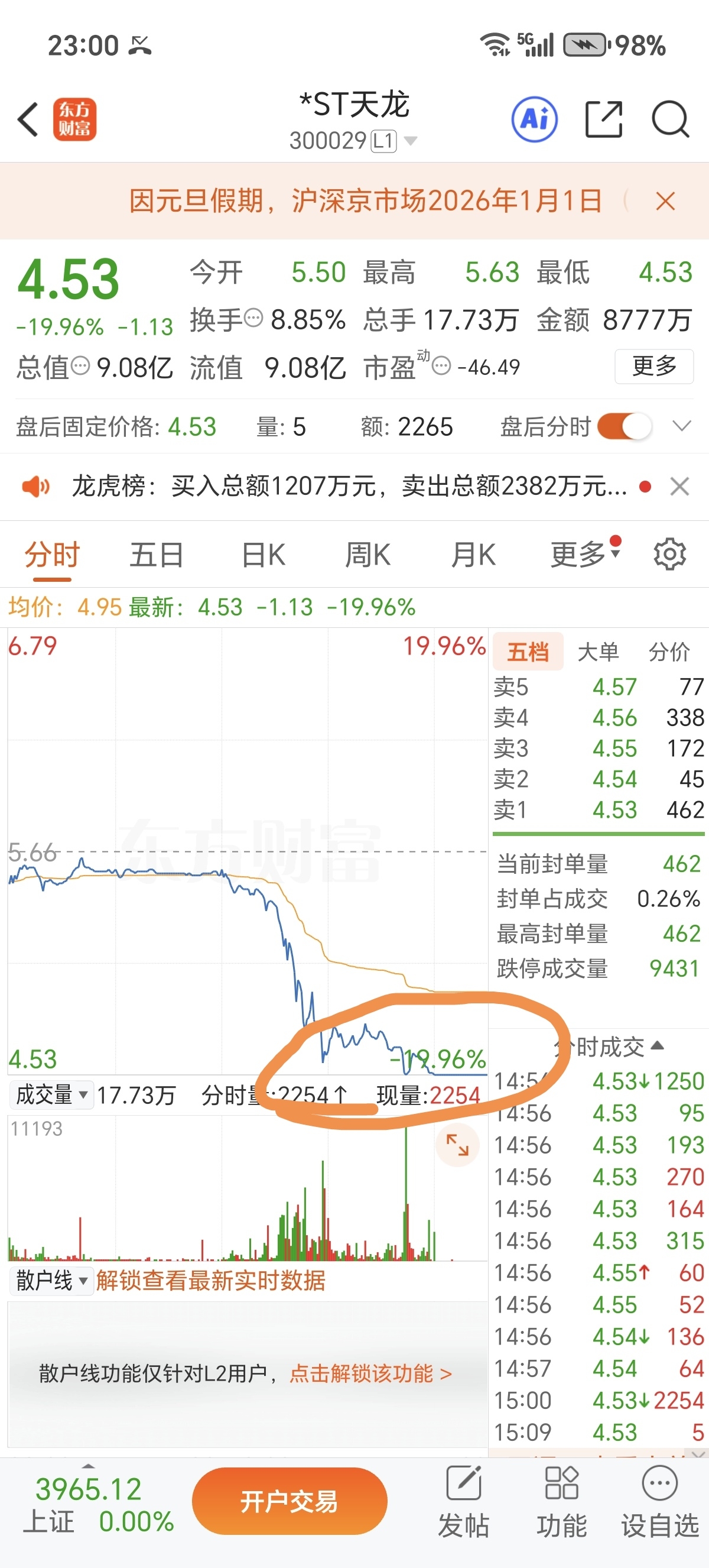 $*ST天龙(SZ300029)$ 大家仔细看,砸盘时间只有半个来小时,大部分时间在接恐慌盘,连多年的钉子户都赶出来了!