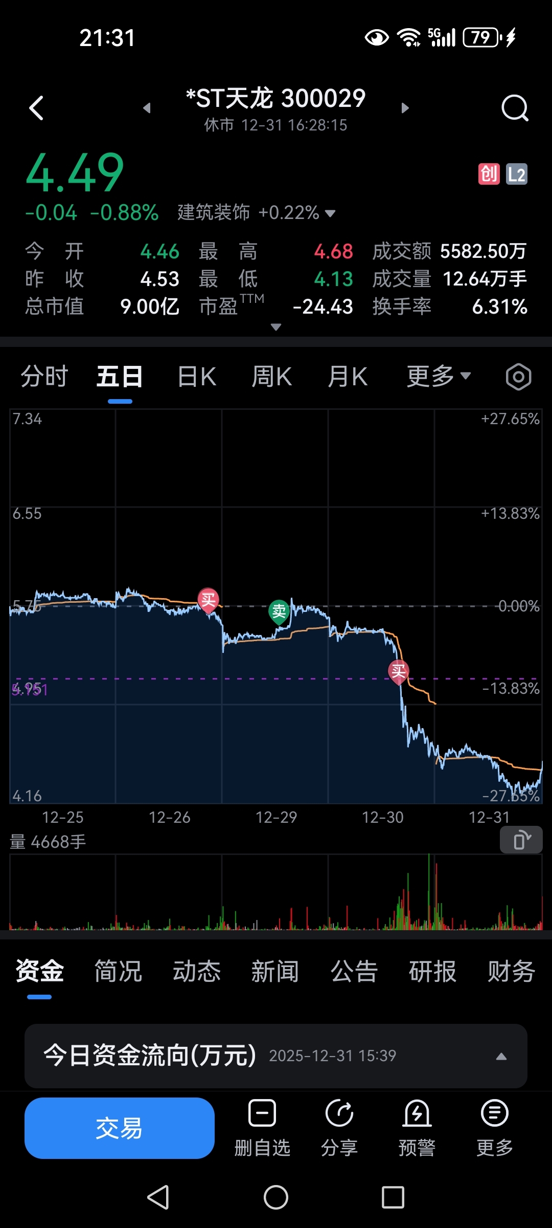 $*ST天龙(SZ300029)$ 昨天-8全仓接了飞刀,亏了12个点,一夜未眠,股票是炒的,怎么这样疯狂的赌捐赠?上午反弹3个点,没有做t,下午又暴跌,一度亏损20%,股吧里几个伥鬼,搞不懂它们。赌赢了,却一点不开心,涌起沉重悲哀,没有右侧交易,也无所谓左侧交易,就这样两眼一黑赌下去,一念天堂,一念地狱……