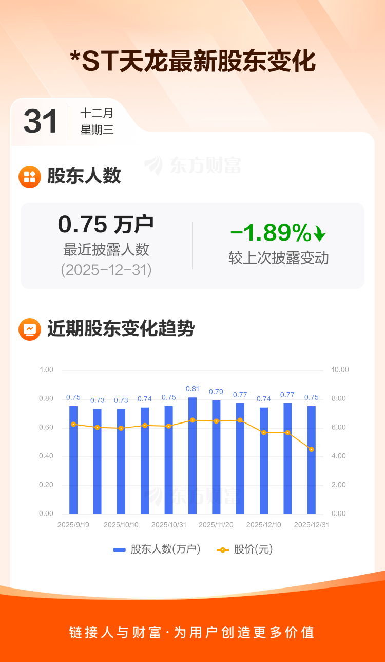 *ST天龙最新披露数据显示,截至12月31日公司股东户数为7512户,较上期(2025年12月19日)减少145户,降幅为1.89%。户均持有流通股数量由上期的2.62万股上升至2.67万股,户均持股金额由上期的14.78万元减少至11.98万元。