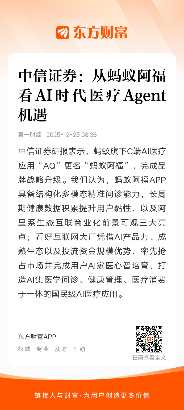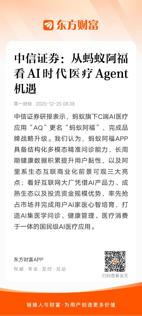 中信证券研报表示,蚂蚁旗下C端AI医疗应用“AQ”更名“蚂蚁阿福”,完成品牌战略升级。我们认为,蚂蚁阿福APP具备结构化多模态精准问诊能力,长周期健康数据积累提升用户黏性,以及阿里系生态互联商业化前景可观三大亮点;看好互联网大厂凭借AI产品力、成熟生态以及投流资金规模优势,率先抢占市场并完成用户AI家医心智培育,打造AI集医学问诊、健康管理、医疗消费于一体的国民级AI医疗应用。