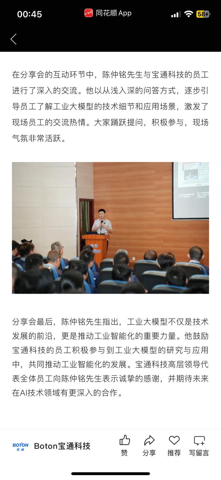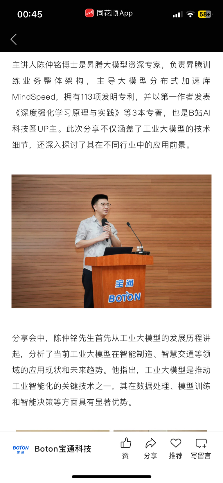 $宝通科技(SZ300031)$ 有华为合作,而且在工业大模型,人工智能,在人工智能技术的浪潮中,宝通科技始终致力于探索和应用前沿技术,推动工业智能化的发展。7月26日,宝通科技特邀昇腾生态技术首席陈仲铭先生,为宝通员工带来了一场主题为《工业大模型与业界发展生态》的技术分享会。本次分享会不仅为宝通提供了一个了解工业大模型领域最新发展趋势和业界动态的平台,也进一步推动了宝通与华为在工业大模型领域的合作。
