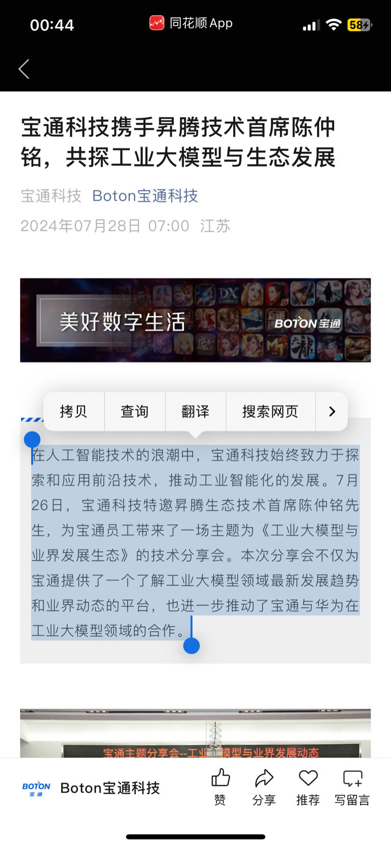 有华为合作,而且在工业大模型,人工智能,在人工智能技术的浪潮中,宝通科技始终致力