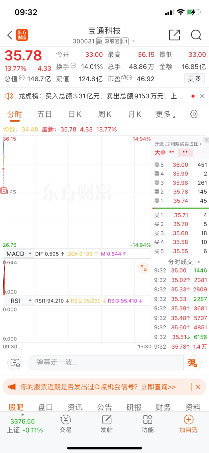 开盘追高介入$宝通科技(SZ300031)$ 不知道有没有机会拿下涨停#强势机会# #实盘记录# #投资干货#
