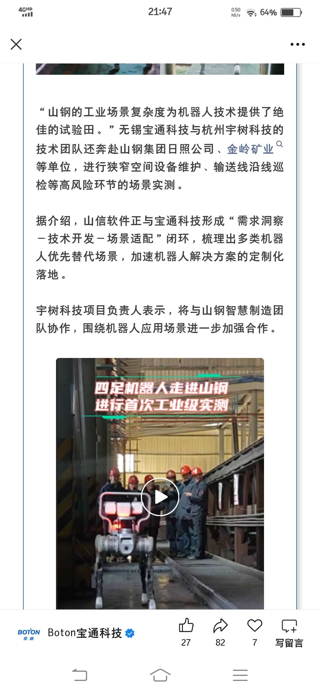 宇树科技项目负责人表示,将与山钢智慧制造团队协作,围绕机器人应用场景进一步加强合作。