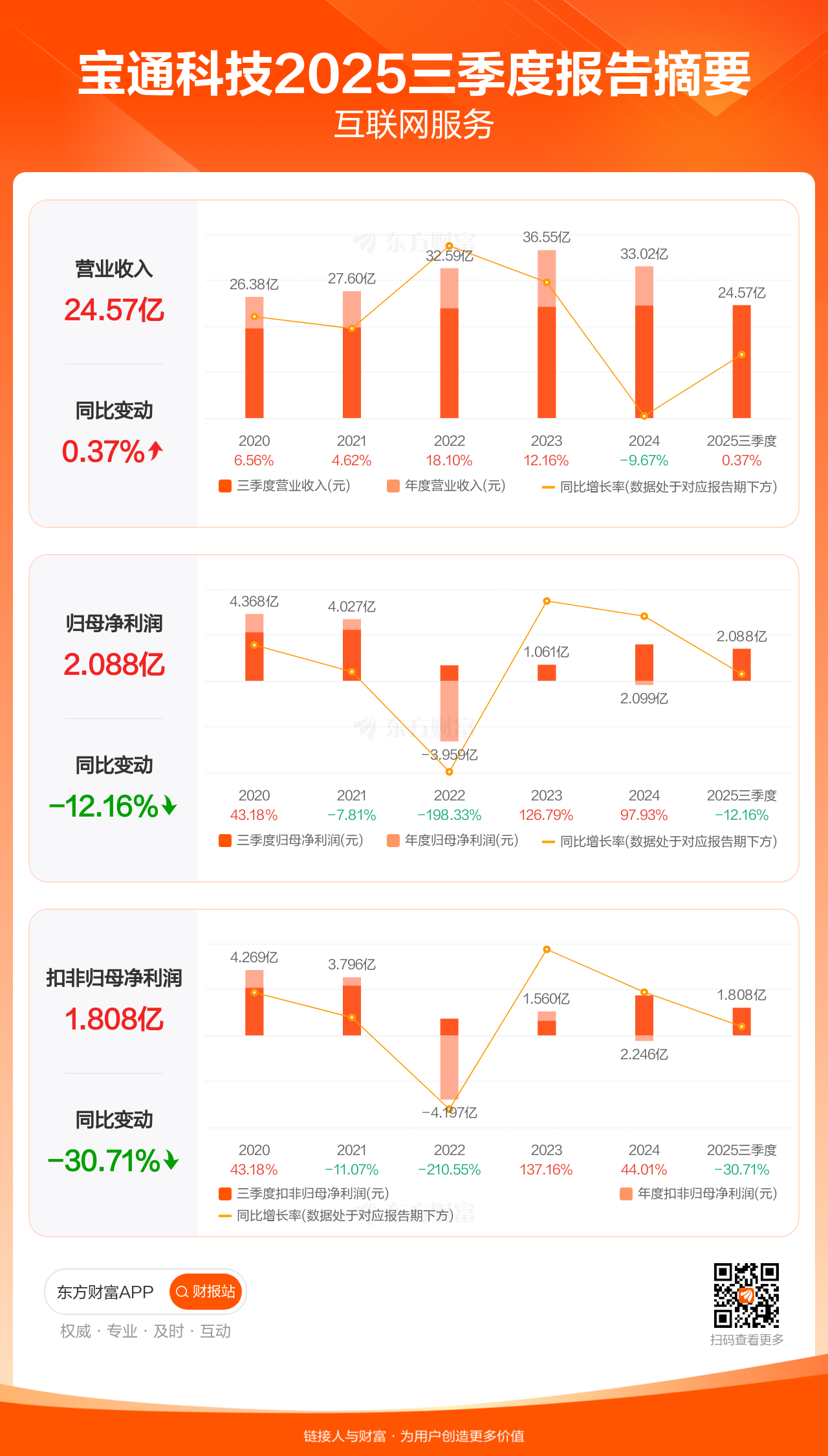 宝通科技10月29日发布2025年三季报显示,公司前三季实现营业收入24.57亿元,同比增长0.37%;归母净利润2.09亿元,同比下滑12.16%;扣非归母净利润1.81亿元,同比下滑30.71%