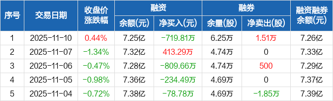 融资方面,当日融资买入1392.8万元,融资偿还2112.62万元,融资净偿还719.81万元。融券方面,融券卖出1.75万股,融券偿还2400股,融券余量6.25万股,融券余额142.81万元。融资融券余额合计7.26亿元。