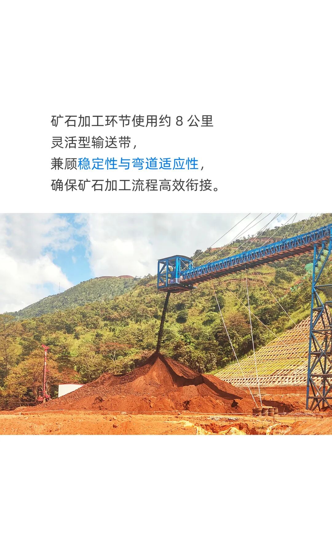 这个项目曾因矿权变更、基础设施缺失和复杂地形等因素拖延了三十年,直到今年11月11日才正式投产。在这样的大型矿山中,长距离、高强度的矿石运输对输送系统要求极高,而宝通正是在这一关键环节承担核心角色。