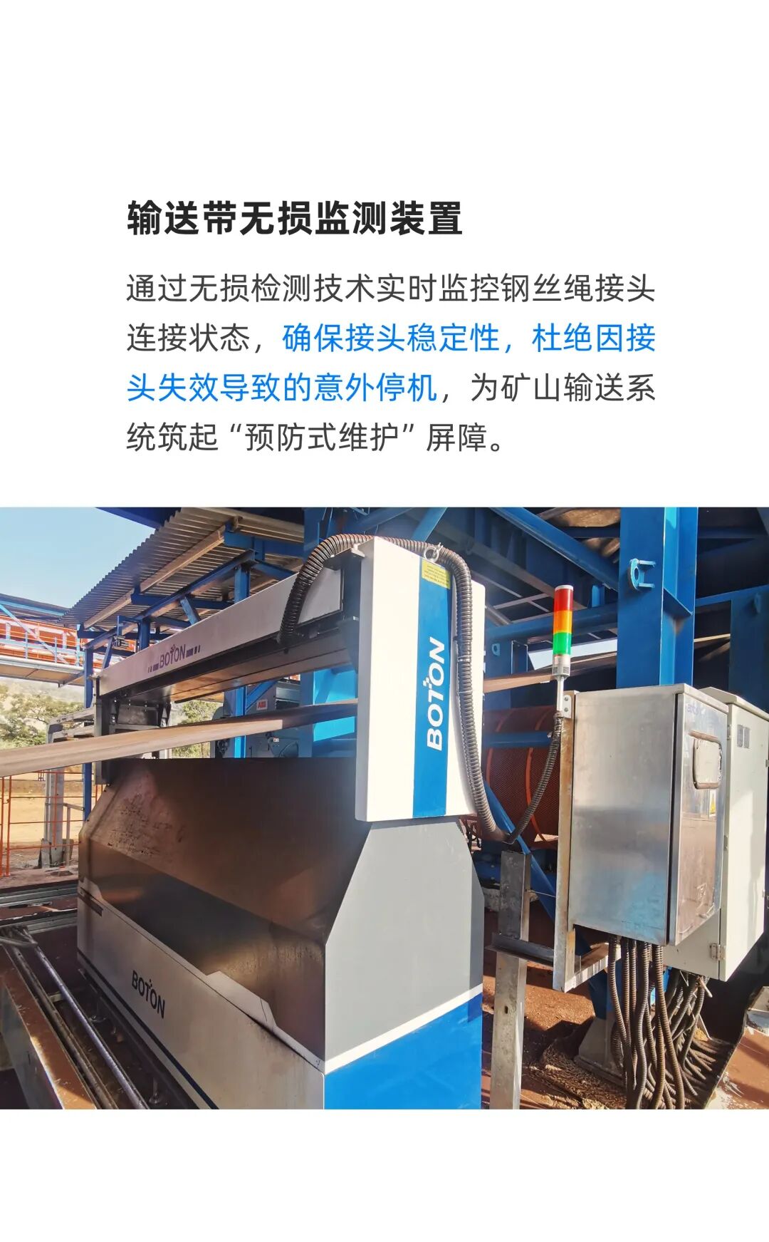 宝通非常清楚这一点,因此在南部矿区率先部署成熟的智能监测设备。通过前瞻式维护,把“等故障发生”变成“提前预见风险”,大幅降低非计划停机,减少人工巡检强度,也显著延长输送带的使用寿命。