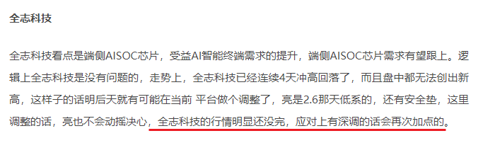 全志科技看点是端侧AISOC芯片,受益AI智能终端需求的提升,端侧AISOC芯片需求有望跟上。走势上,昨天全志科技走的偏弱,在指数大涨的情况下,也仅仅是刚翻红而已,盘中还回踩了下10日线,不过要是看过亮哥我2.12日盘前分析的话,昨天却是一个很好的做节奏的节点。短期全志科技大概率还会在10日线位置震荡洗盘,这里由于有解禁股的影响,可能会延续整理几天,但是后面总体趋势向上。亮哥我昨天做个T后,整体安全垫比2.6那天低系的还要高,这里调整的话也不会动摇决心