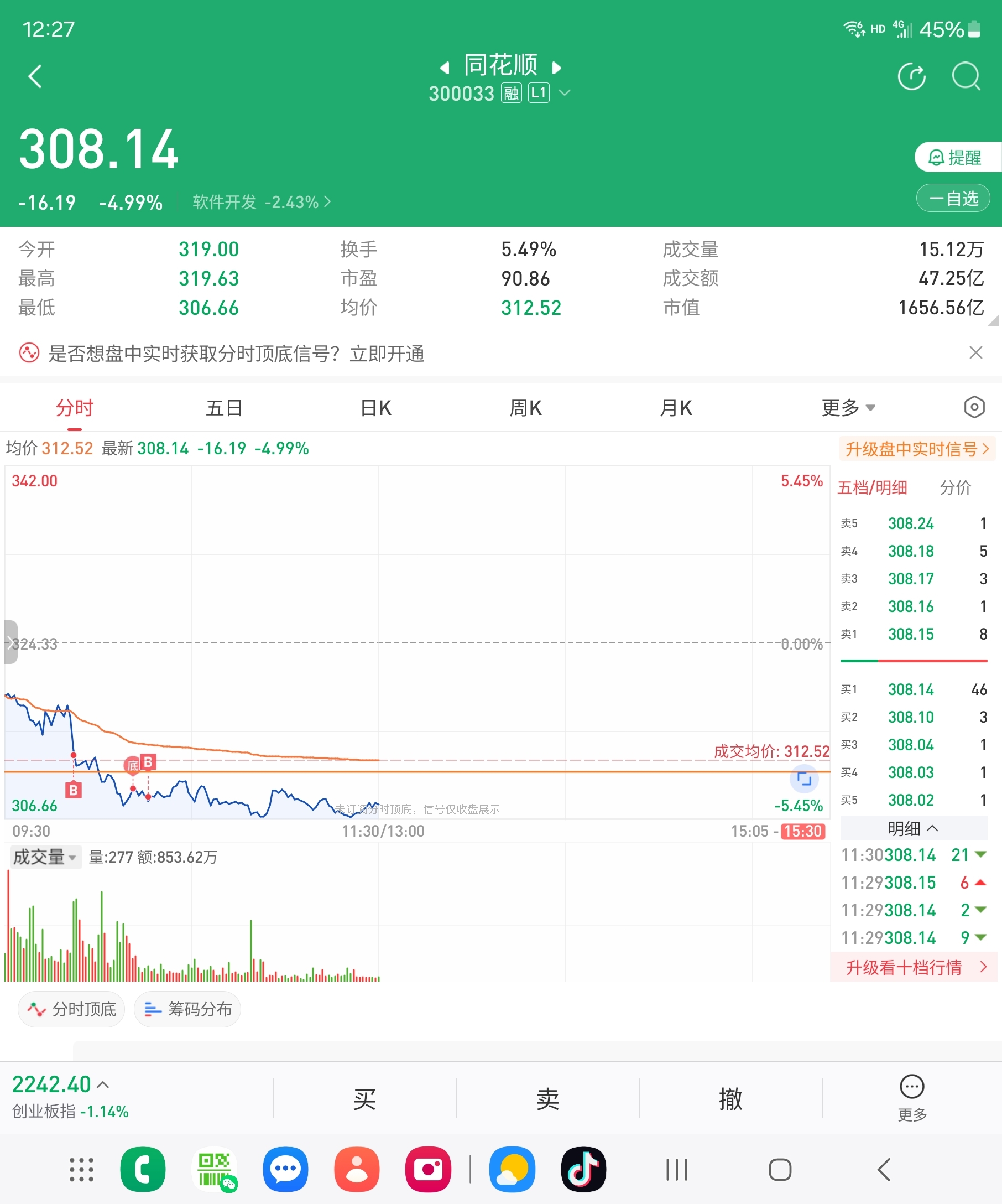 连续五天加到半仓,平均成本310,破300加满,趋势已经形成,技术面没问题,做t等主升浪