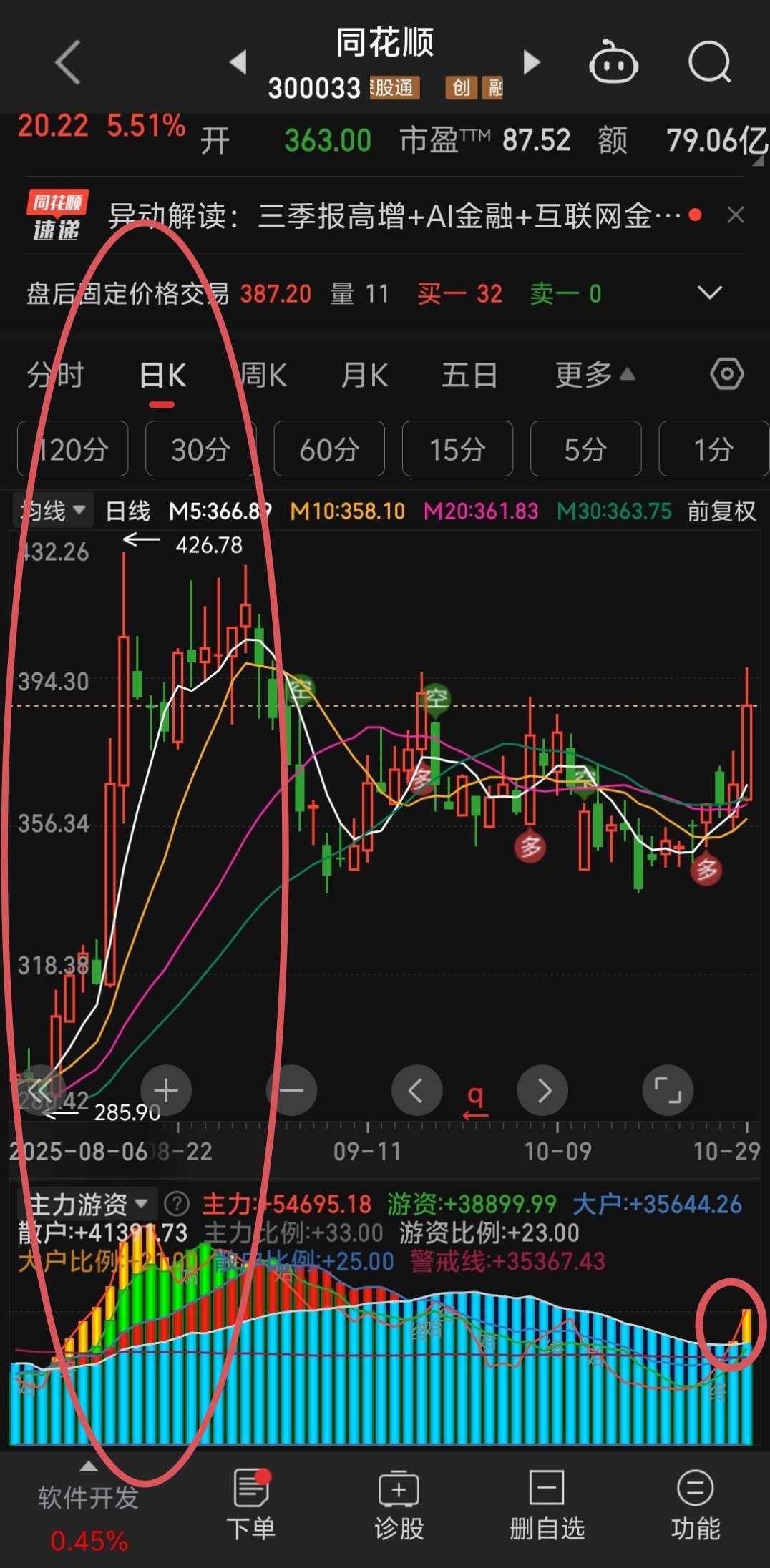 同花顺大主力开始介入了,但是同花顺没有涨停基因。券商涨停基因还是看指南针