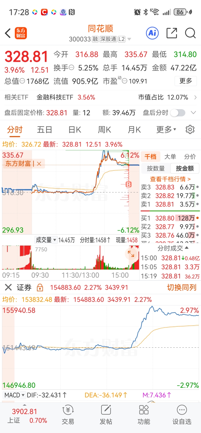 $同花顺(SZ300033)$ $东方财富(SZ300059)$ 周一要加仓吗?还是开盘高点跑!本以为看见资金流动,就买了1手建个仓,板块大利好大概率高开了!难忘祖训啊!