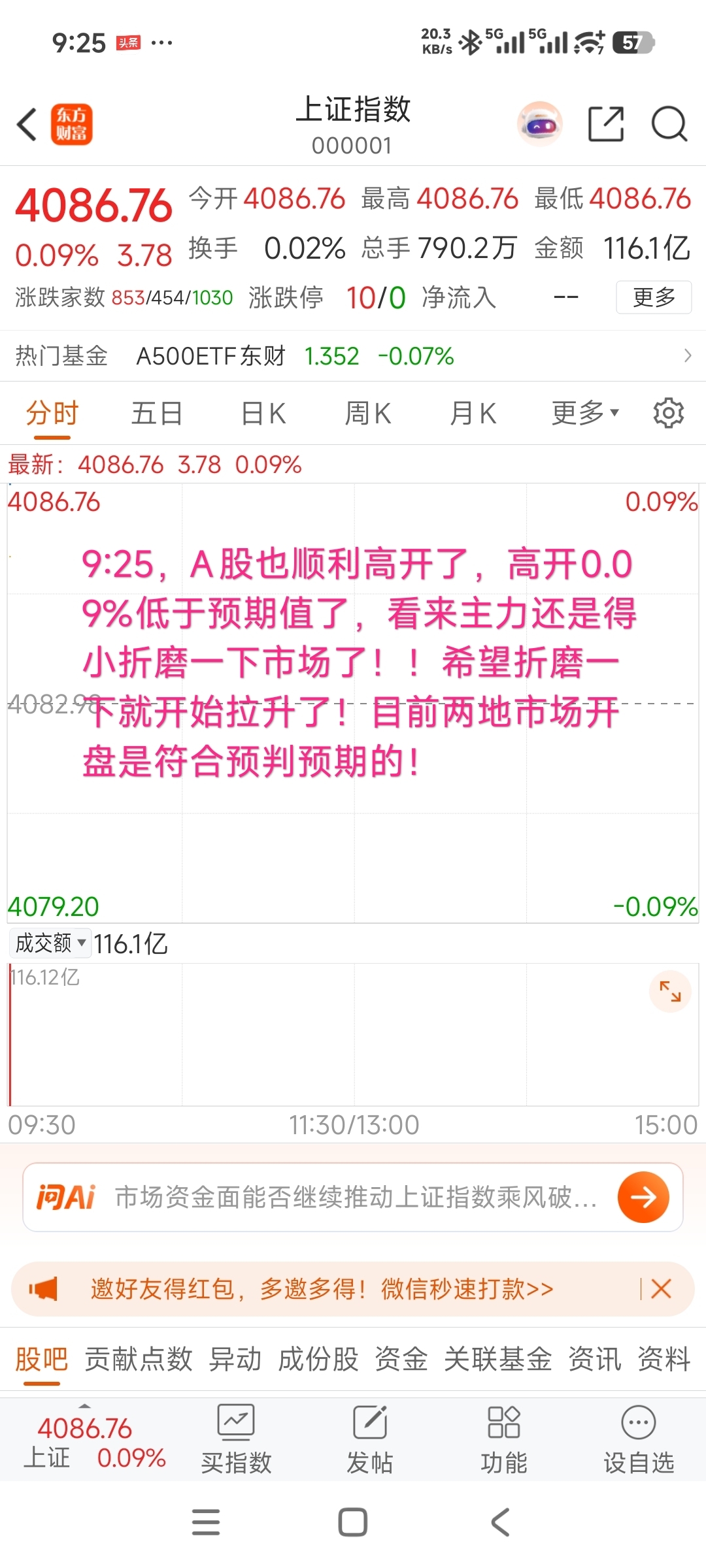 9:25,A股也顺利高开了,高开0.09%低于预期值了,看来主力还是得小折磨一下市场了!!希望折磨一下就开始拉升了!目前两地市场开盘是符合预判预期的!