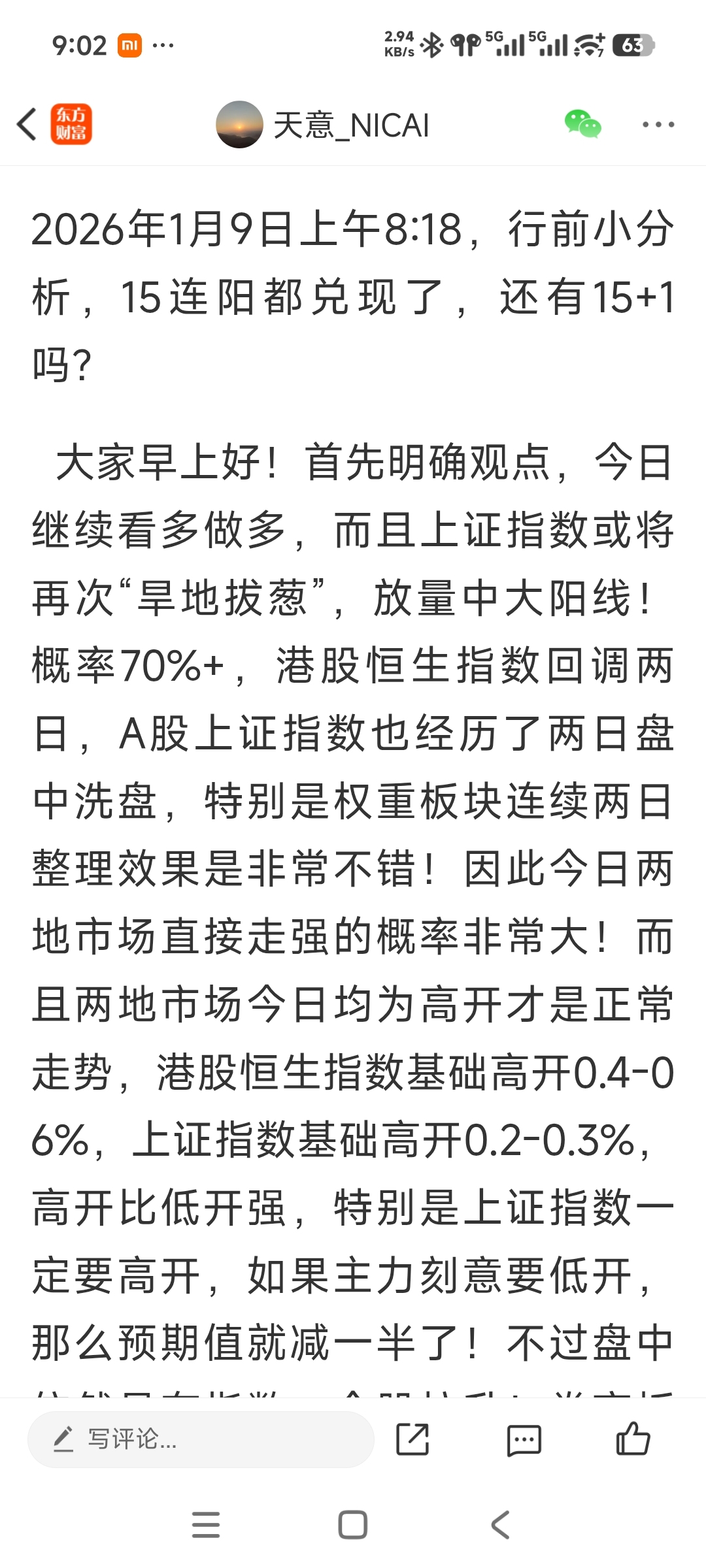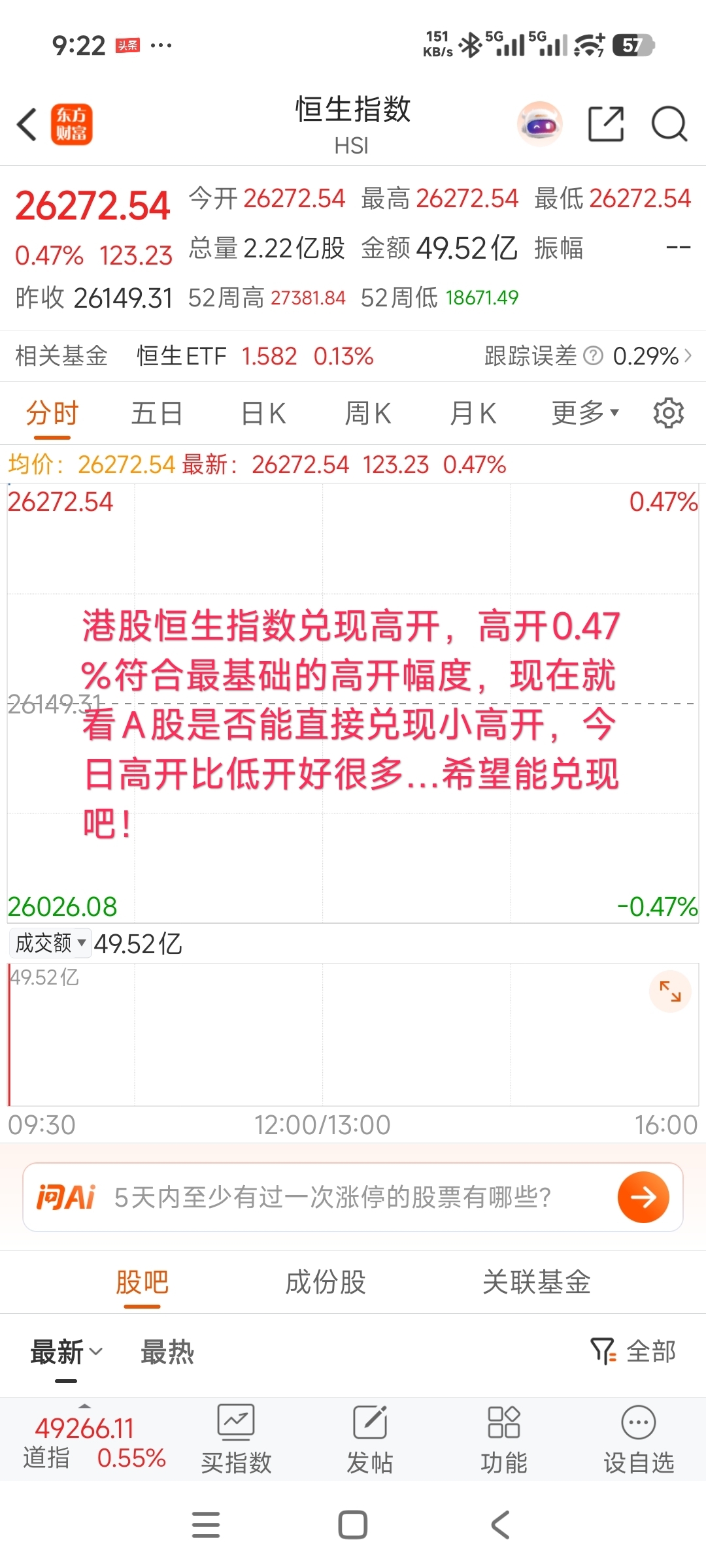 $上证指数(SH000001)$ #炒股日记# #复盘记录# #强势机会# #股市怎么看# $深证成指(SZ399001)$ $东方财富(SZ300059)$ 港股恒生指数兑现高开,高开0.47%符合最基础的高开幅度,现在就看A股是否能直接兑现小高开,今日高开比低开好很多…希望能兑现吧!