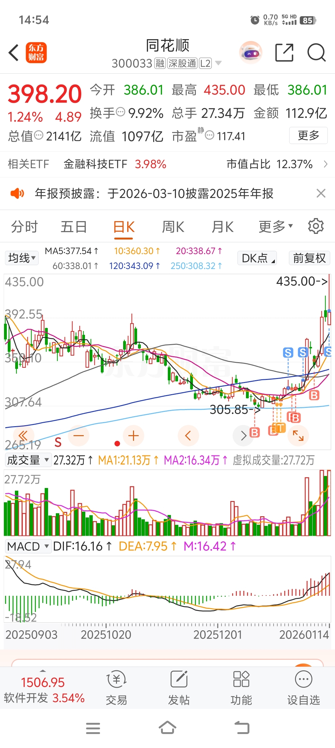 $同花顺(SZ300033)$ 清仓,五日线再进。我认为依旧还有空间,时间问题,逻辑是这么大成交量可以想象一下26年一季度业绩多爆炸,股价最少可以到450